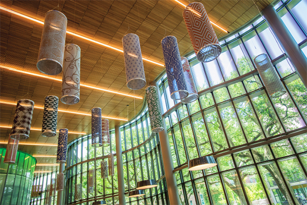 In addition to a permanent collection of paintings and sculptures, the building features a rotating collection of artworks curated by Newcomb Art Museum — including examples of Newcomb pottery — and the Ogden Museum of Southern Art. The complex is also furnished with benches made in part from Chinese cypress trees removed from the building site prior to construction. While removing the trees was unavoidable, their beauty and spirit live on in the Marshall Family Commons.