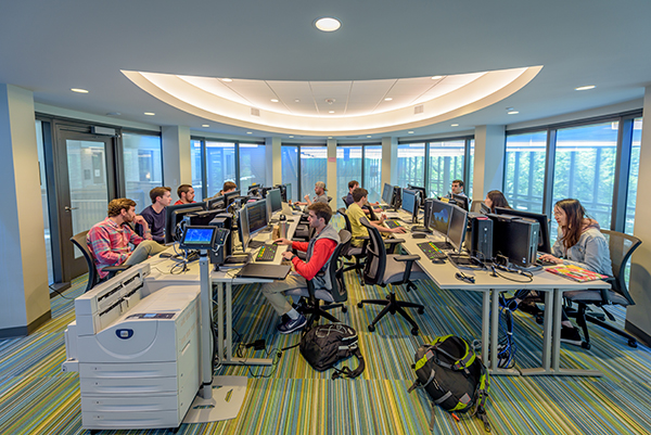 Housed in one of the two elliptical classroom towers, the new Financial Analysis Lab features 14 terminals offering access to resources including Bloomberg Academic, Capital IQ, Morningstar Direct, DataStream and SDC Platinum.