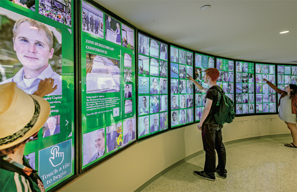 The centerpiece of the Student Gateway, however, is the video wall, a 27-foot array of touch-screen monitors that displays stunning panoramic video and exclusive interactive content, much of it highlighting the people who make up the Freeman community — students, faculty, staff, alumni, employers and school friends.