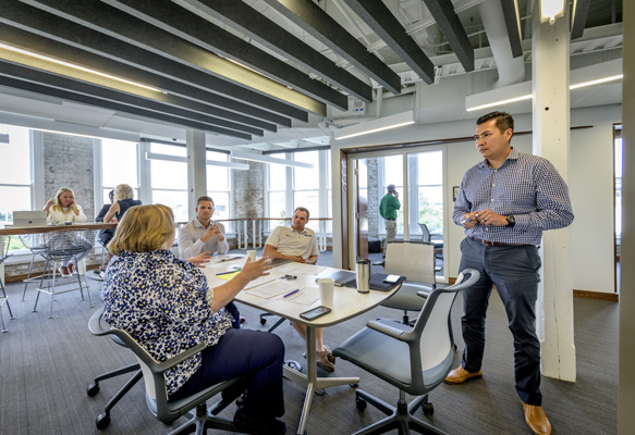 Clockwise from left, EMBA students Patricia McCarty, Micah Schilling, John Mouton and Chung Hui work on a project in one of Stewart Center CBD’s open work spaces.