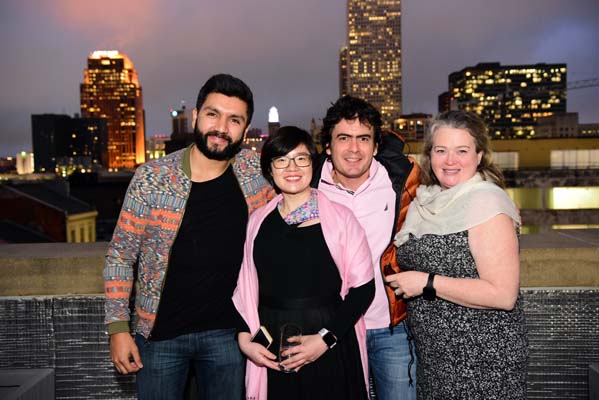 International Intensive Week students Jorge Sierra (ICESI), Suyun Chen (Shanghai Jiao Tong University), Rodrigo Santacoloma (ICESI) and Karen Smith (MBA ’19), left to right, enjoy the view from the Stewart Center CBD’s fifth-floor terrace during a reception.